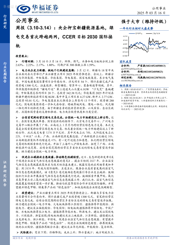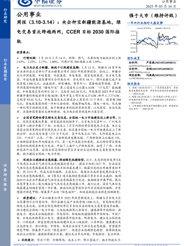 【华福证券】【20250316】公用事业周报:央企押宝新疆能源基地,绿电交易首次跨越两网,CCER目标2030国际接轨-20页