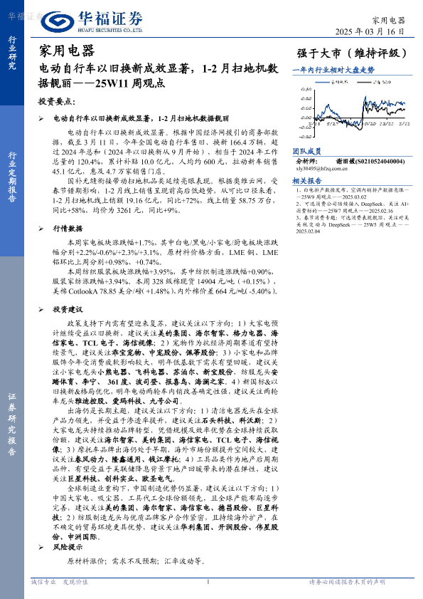 【华福证券】【20250316】家用电器25W11周观点:电动自行车以旧换新成效显著,1-2月扫地机数据靓丽-13页
