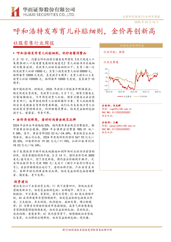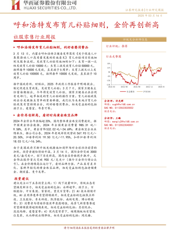 【华西证券】【20250316】20250316-华西证券-社服零售行业周报:呼和浩特发布育儿补贴细则,金价再创新高-13页