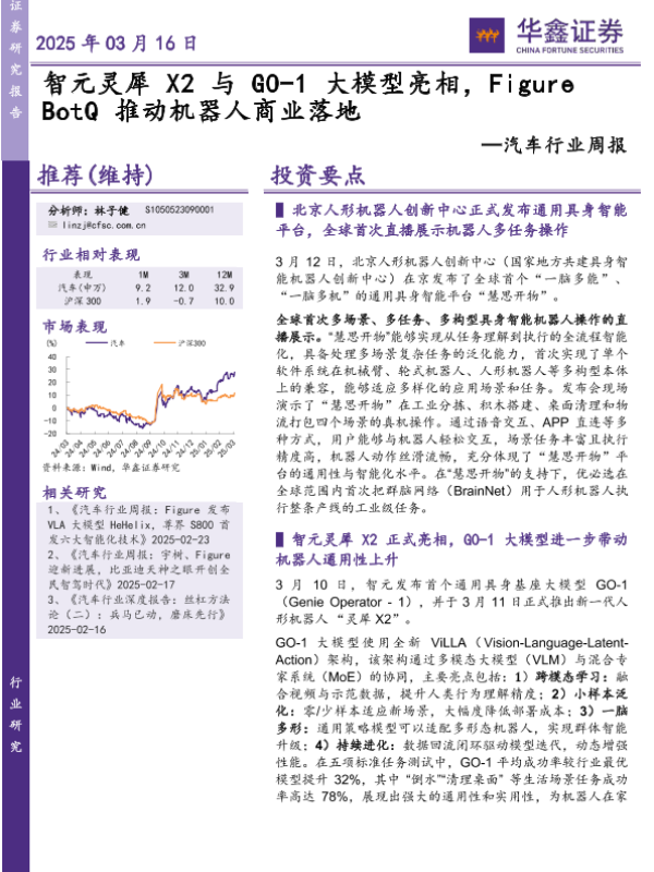 【华鑫证券】【20250316】20250316-华鑫证券-汽车行业周报:智元灵犀X2与GO-1大模型亮相,Figure BotQ推动机器人商业落地-18页