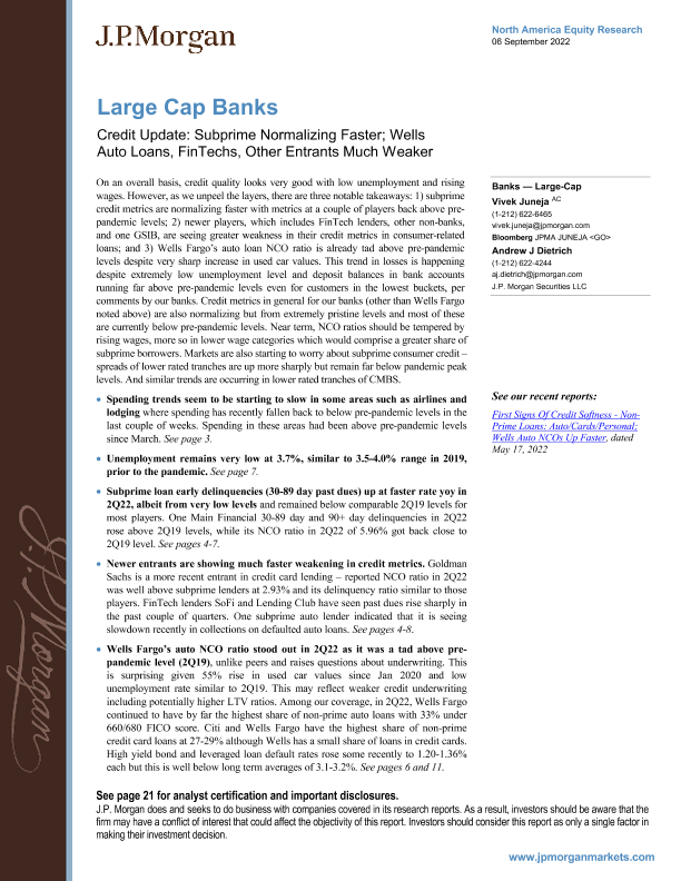 【J.P. Morgan】【20220906】Large Cap Banks - Credit Update - Subprime Normalizing Faster-20页