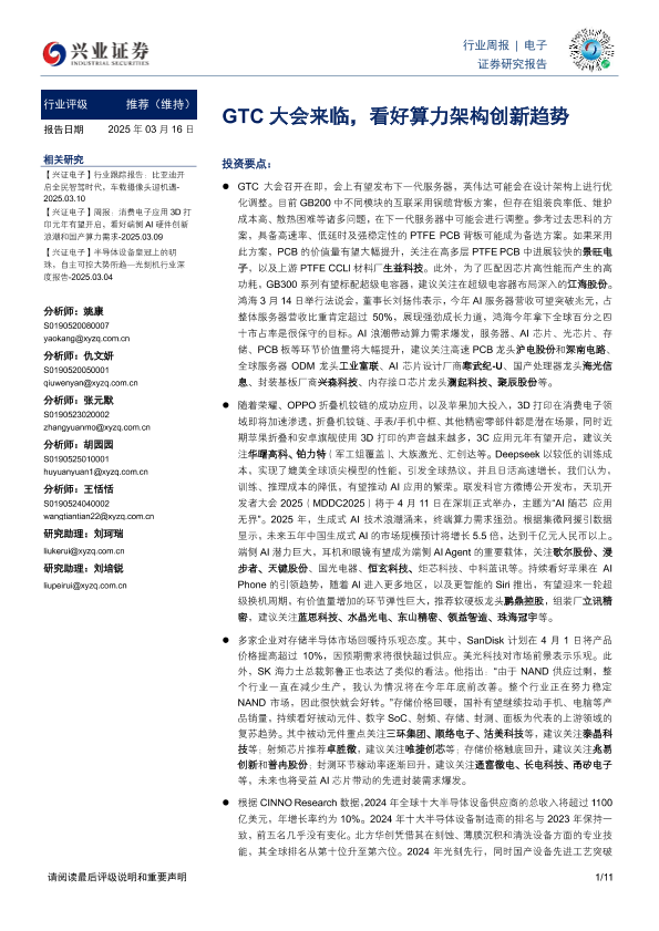 【兴业证券】【20250316】20250316-兴业证券-电子行业周报:GTC大会来临,看好算力架构创新趋势-11页