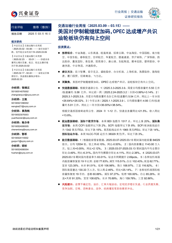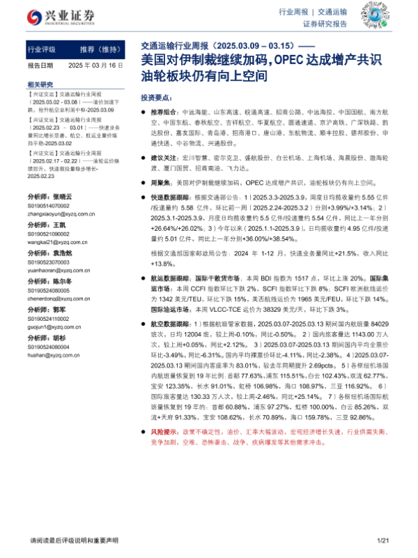 【兴业证券】【20250316】20250316-兴业证券-交通运输行业周报:美国对伊制裁继续加码,OPEC达成增产共识,油轮板块仍有向上空间-21页