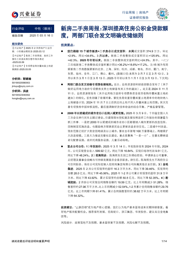 【兴业证券】【20250316】20250316-兴业证券-新房二手房周报:深圳提高住房公积金贷款额度,两部门联合发文明确收储细则-14页