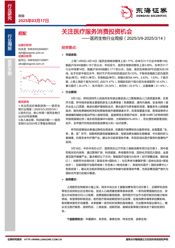 【东海证券】【20250317】20250317-东海证券-医药生物行业周报:关注医疗服务消费投资机会-12页