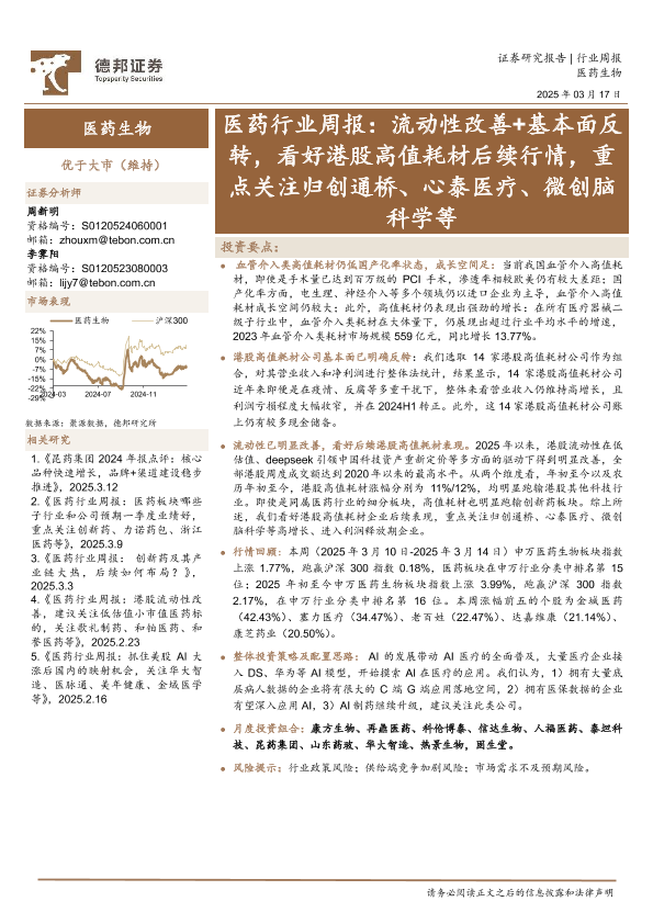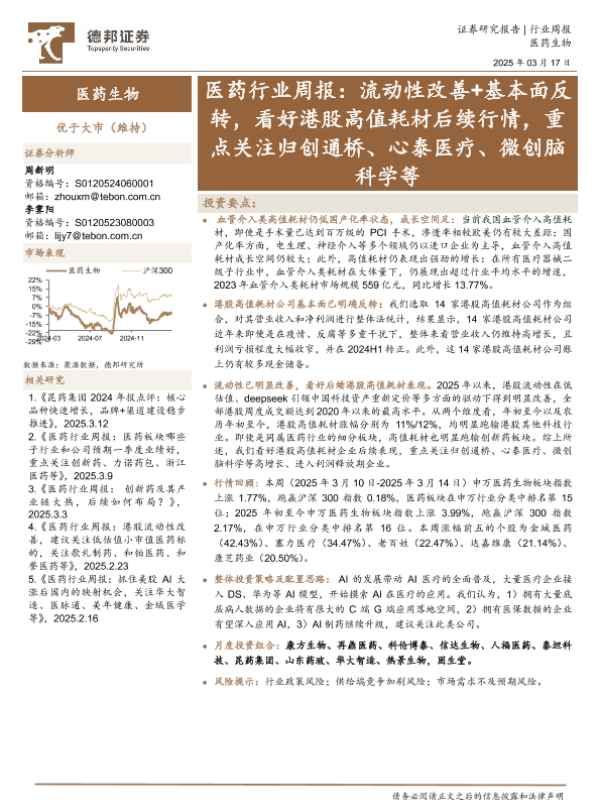 【德邦证券】【20250317】20250317-德邦证券-医药行业周报:流动性改善+基本面反转,看好港股高值耗材后续行情,重点关注归创通桥、心泰医疗、微创脑科学等-20页