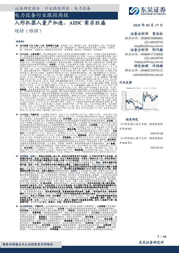 【东吴证券】【20250317】电力设备行业跟踪周报:人形机器人量产加速、AIDC需求旺盛-46页