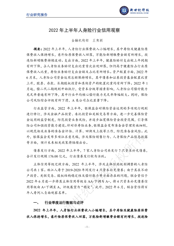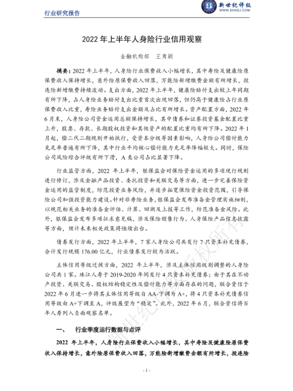 【新世纪评级】【2022】2022年上半年人身险行业信用观察-12页