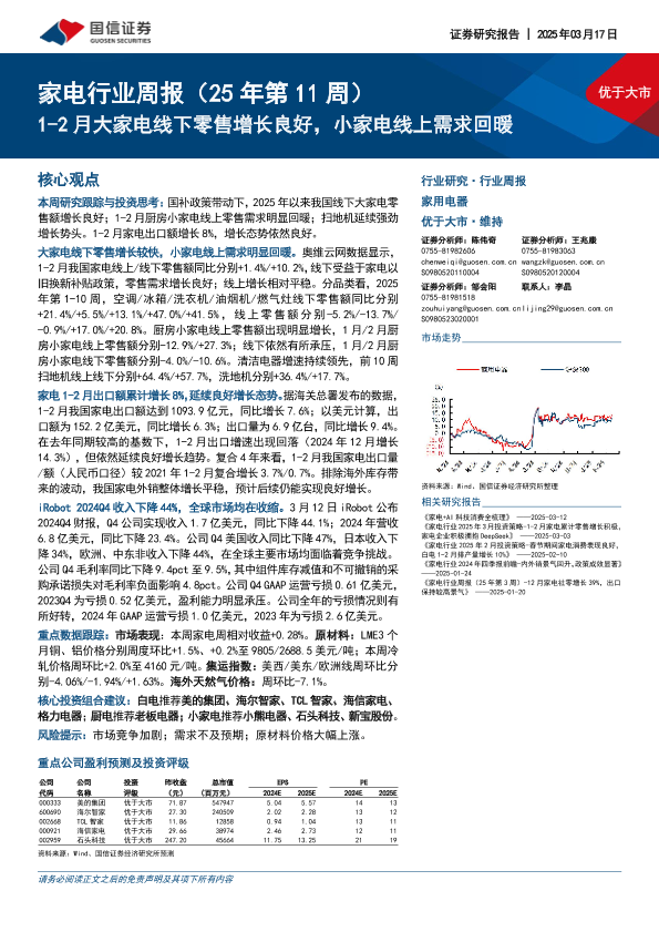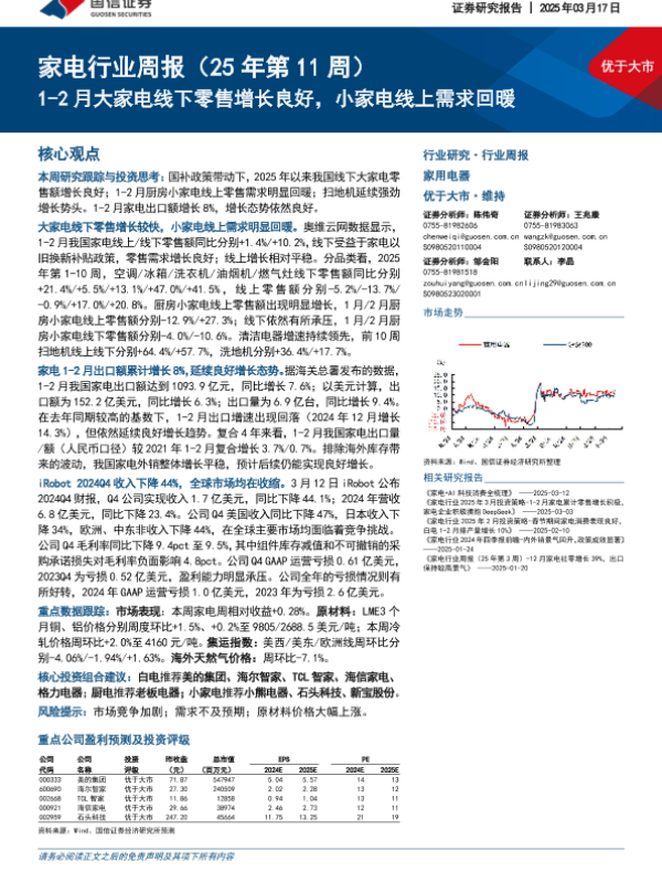 【国信证券】【20250317】20250317-国信证券-家电行业周报(25年第11周):1-2月大家电线下零售增长良好,小家电线上需求回暖-14页