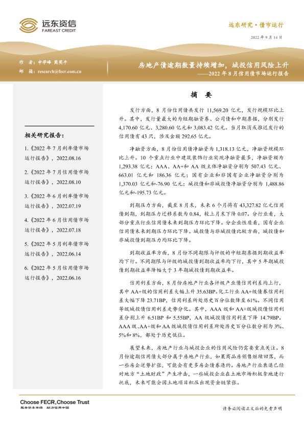 【远东资信】【20220914】2022年8月信用债市场运行报告:房地产债逾期数量持续增加,城投信用风险上升-19页