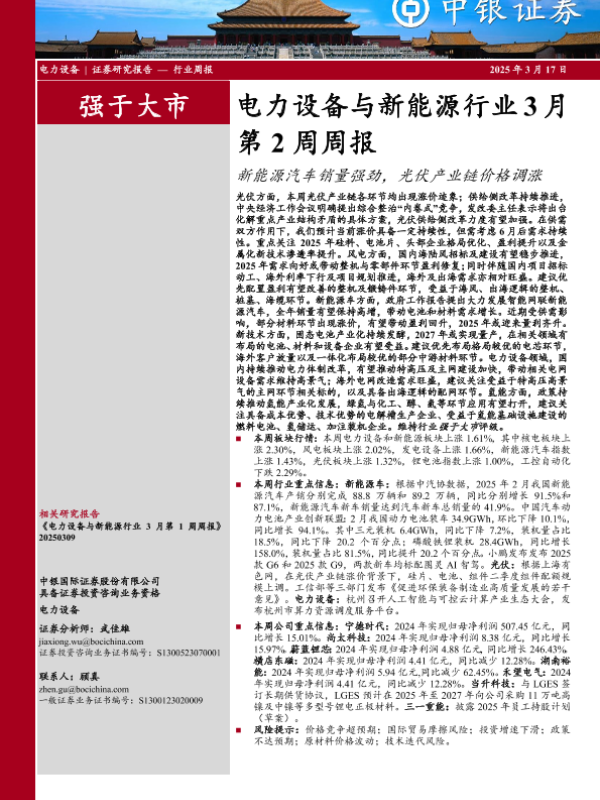 【中银证券】【20250317】电力设备与新能源行业3月第2周周报:新能源汽车销量强劲,光伏产业链价格调涨-12页