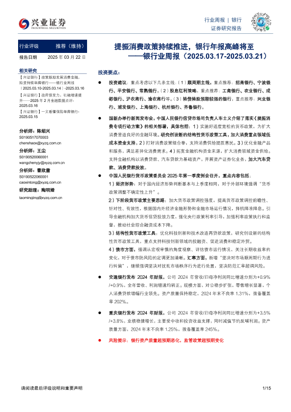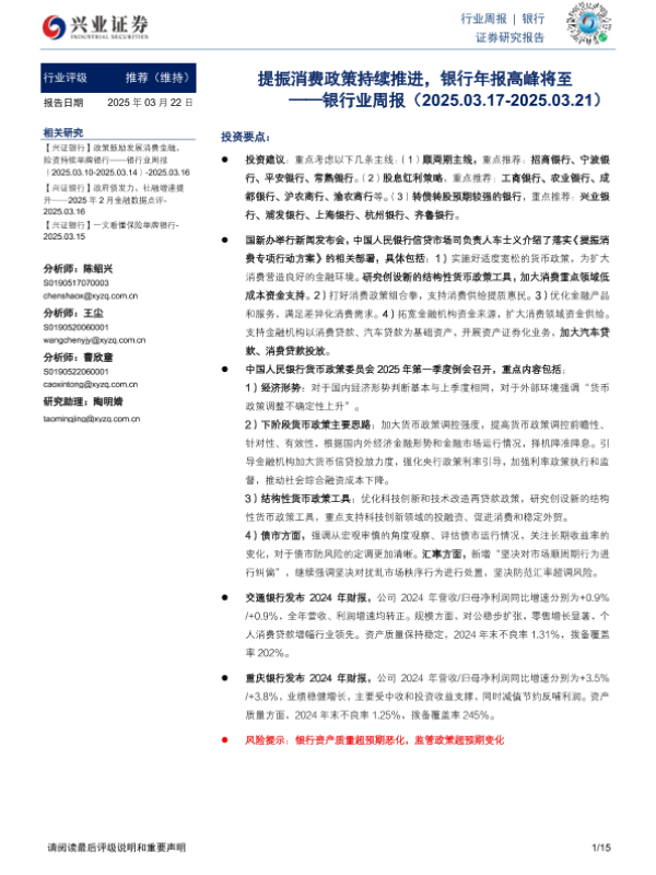 【兴业证券】【20250322】20250322-兴业证券-银行业周报:提振消费政策持续推进,银行年报高峰将至-15页