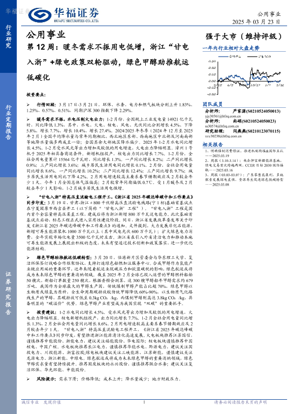 【华福证券】【20250323】公用事业第12周:暖冬需求不振用电低增,浙江“甘电入浙”+绿电政策双轮驱动,绿色甲醇助推航运低碳化-25页