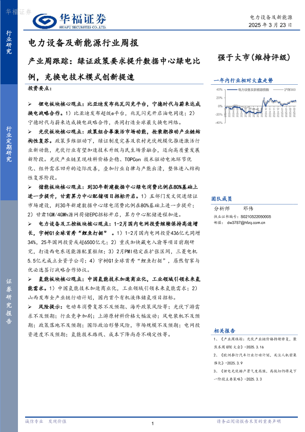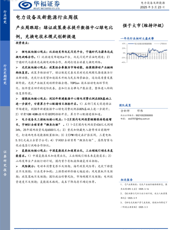 【华福证券】【20250323】电力设备及新能源行业周报:产业周跟踪,绿证政策要求提升数据中心绿电比例,充换电技术模式创新提速-15页