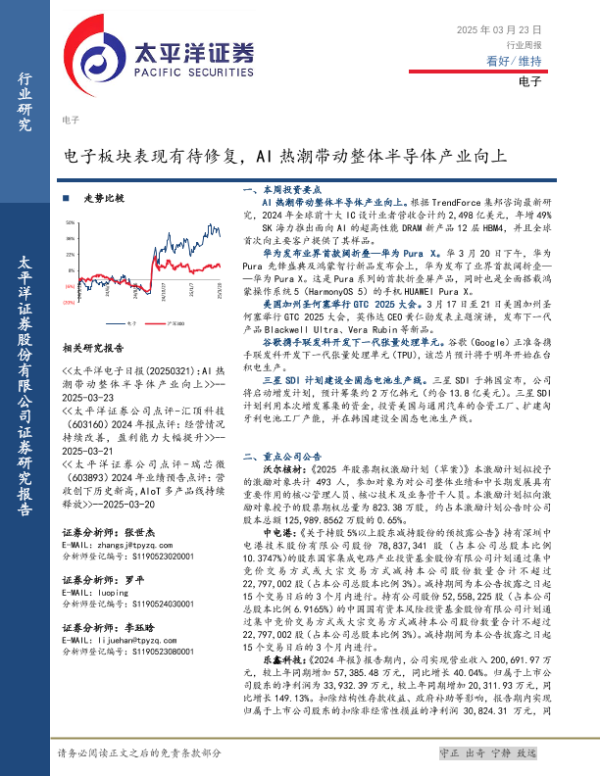 【太平洋证券】【20250323】20250323-太平洋-电子行业周报:电子板块表现有待修复,AI热潮带动整体半导体产业向上-11页