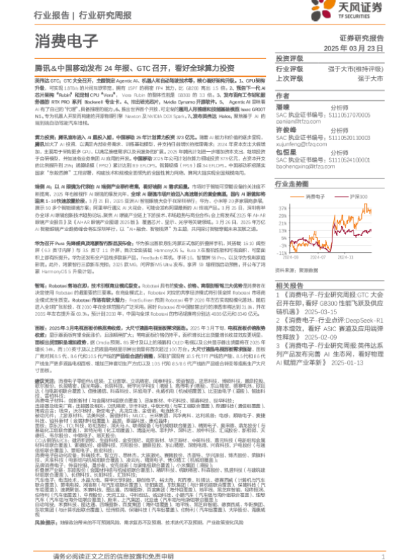 【天风证券】【20250323】消费电子行业研究周报:腾讯&中国移动发布24年报、GTC召开,看好全球算力投资-23页