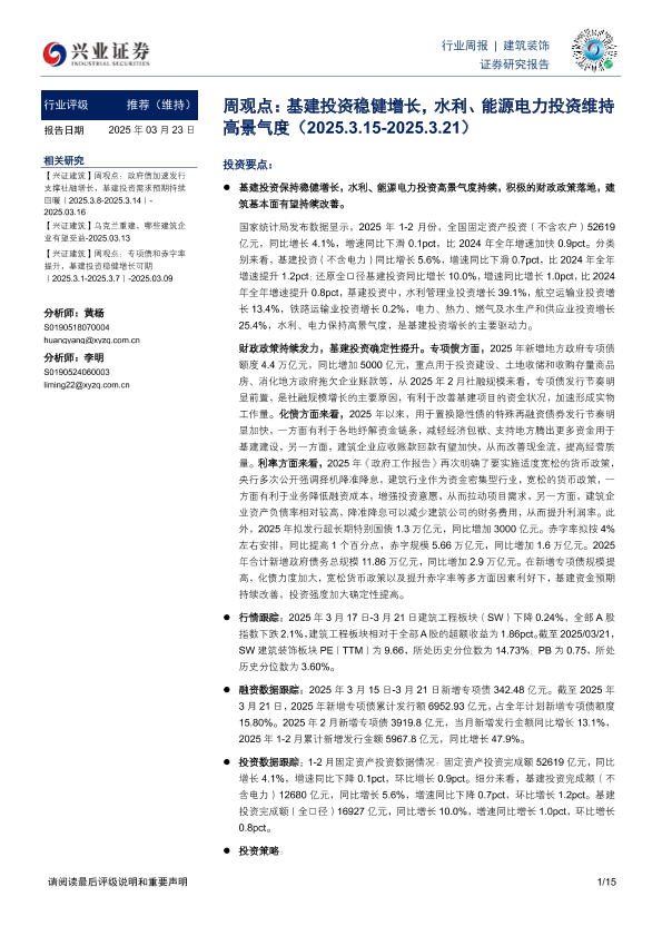 【兴业证券】【20250323】20250323-兴业证券-建筑装饰行业周观点:基建投资稳健增长,水利、能源电力投资维持高景气度-15页