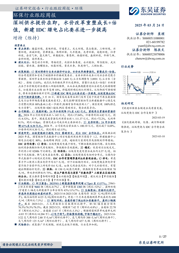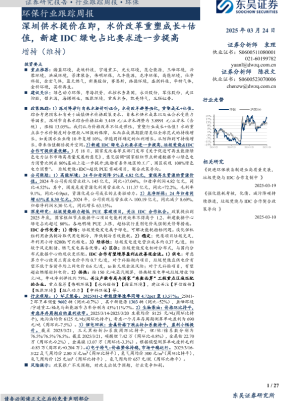 【东吴证券】【20250324】20250324-东吴证券-环保行业跟踪周报:深圳供水提价在即,水价改革重塑成长+估值,新建IDC绿电占比要求进一步提高-27页