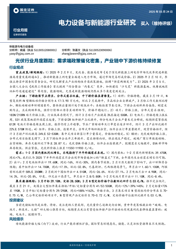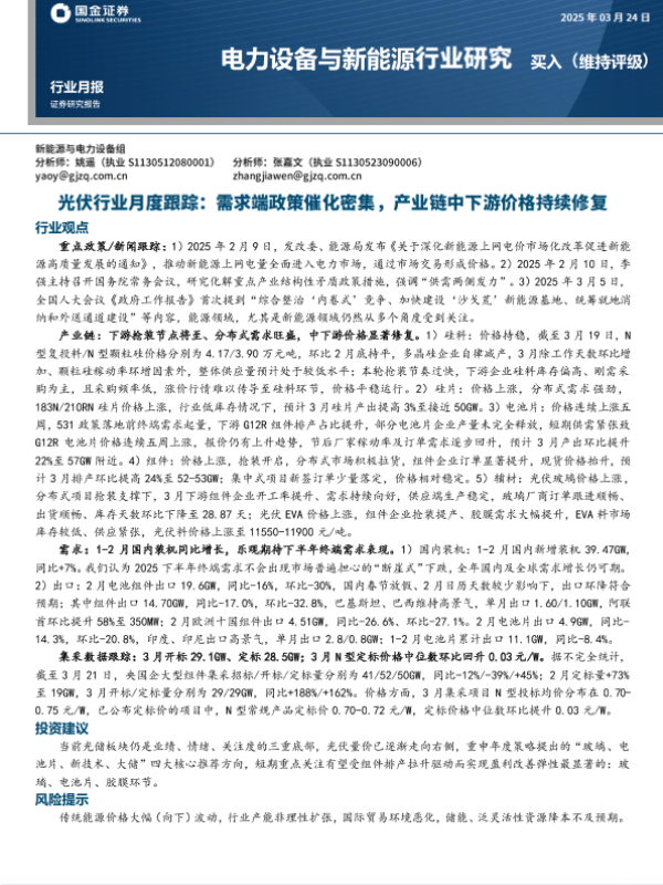 【国金证券】【20250324】光伏行业月度跟踪:需求端政策催化密集,产业链中下游价格持续修复-22页