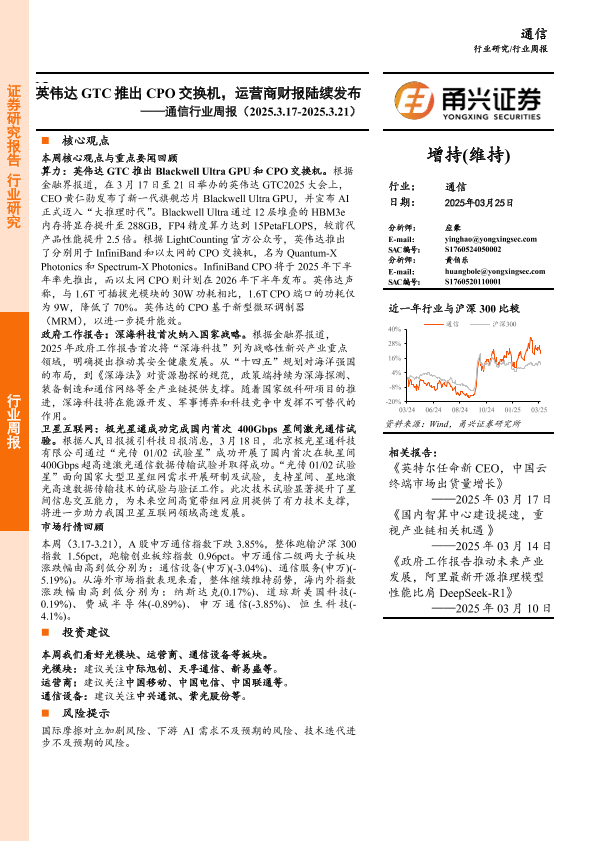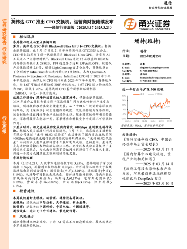 【甬兴证券】【20250325】20250325-甬兴证券-通信行业周报:英伟达GTC推出CPO交换机,运营商财报陆续发布-12页