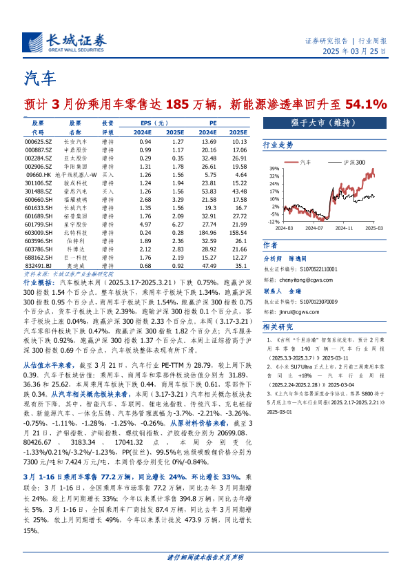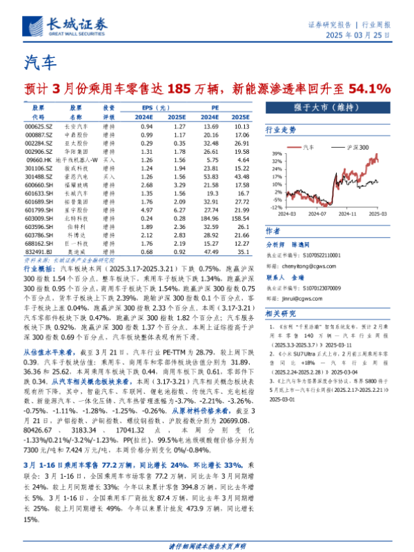【长城证券】【20250325】汽车行业周报:预计3月份乘用车零售达185万辆,新能源渗透率回升至54.1%-11页