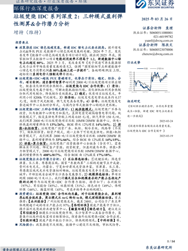 【东吴证券】【20250326】垃圾焚烧IDC系列深度2:三种模式盈利弹性测算&合作潜力分析-14页