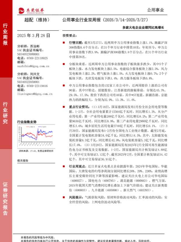 【东莞证券】【20250328】公用事业行业双周报:多家火电企业业绩同比高增长-10页