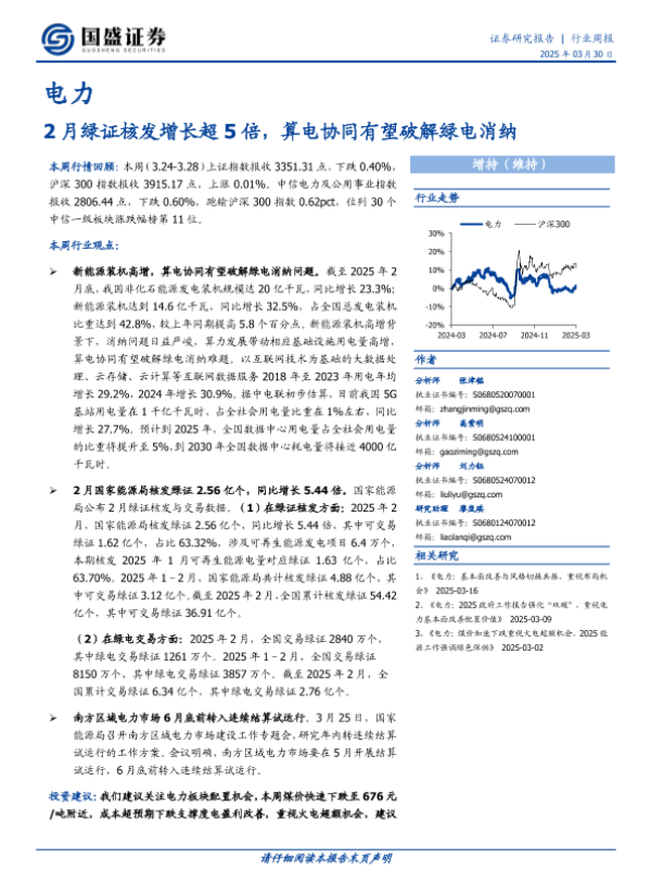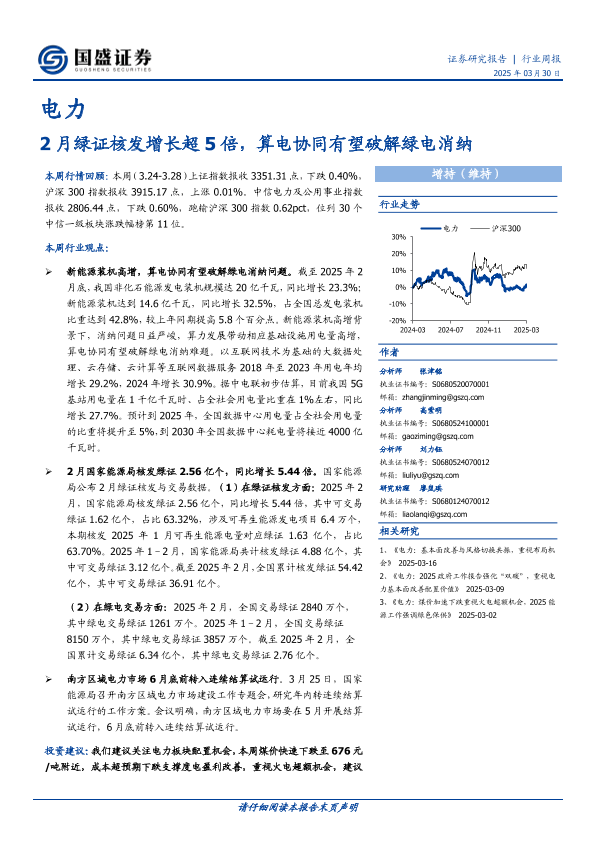 【国盛证券】【20250330】20250330-国盛证券-电力行业周报:2月绿证核发增长超5倍,算电协同有望破解绿电消纳-14页