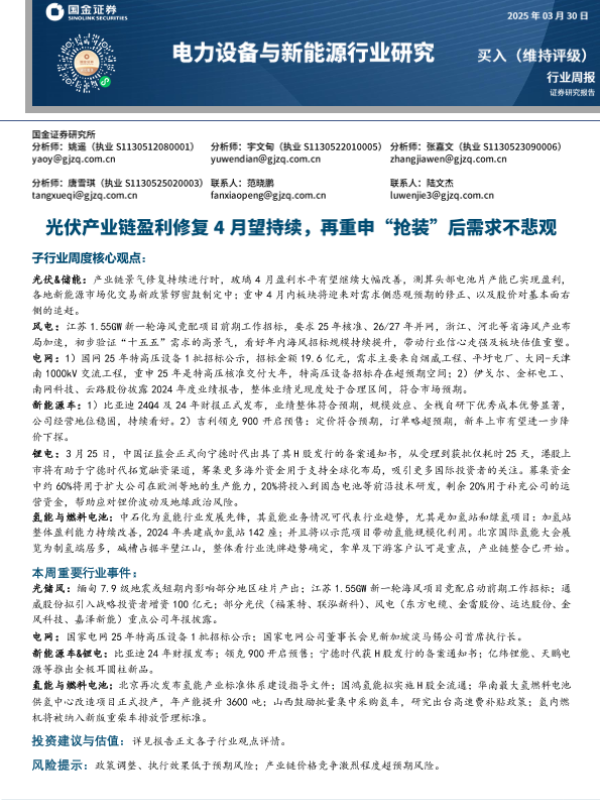 【国金证券】【20250330】20250330-国金证券-电力设备与新能源行业研究:光伏产业链盈利修复4月望持续,再重申“抢装”后需求不悲观-17页