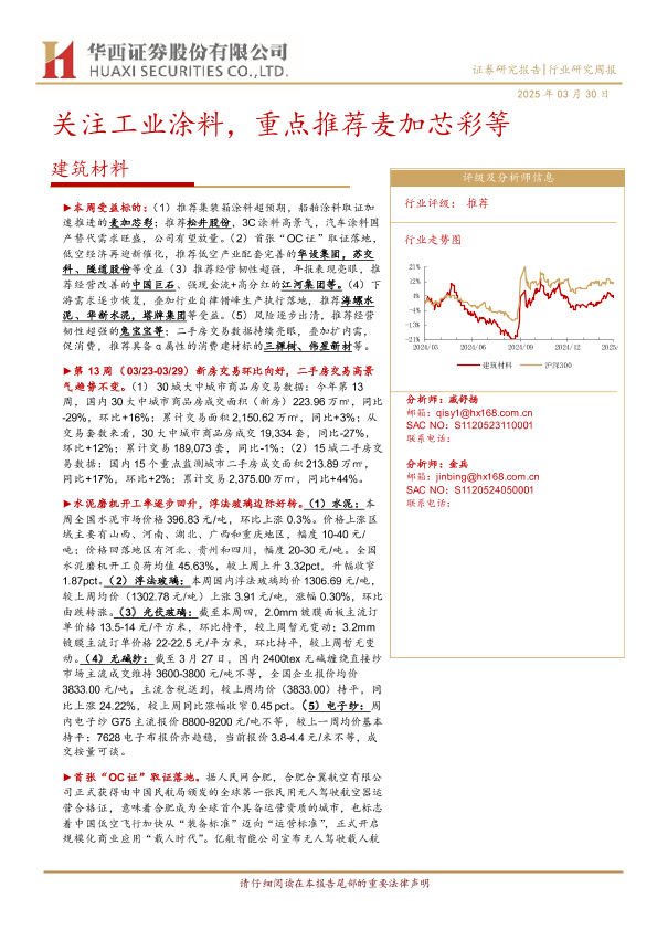 【华西证券】【20250330】20250330-华西证券-建筑材料行业研究周报:关注工业涂料,重点推荐麦加芯彩等-23页