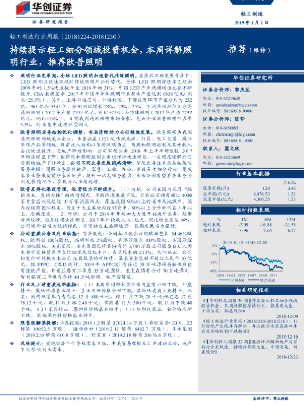 【华创证券】【20190101】20190101-华创证券-轻工制造行业周报:持续提示轻工细分领域投资机会,本周详解照明行业,推荐欧普照明-16页
