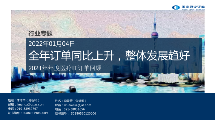 【国泰君安证券】【20220104】医疗行业专题:2021年年度医疗IT订单回顾,全年订单同比上升,整体发展趋好-15页