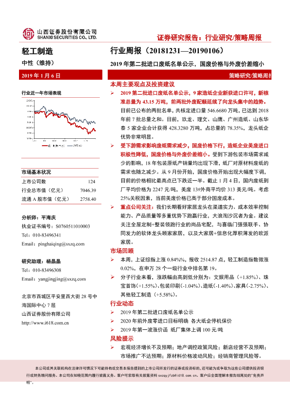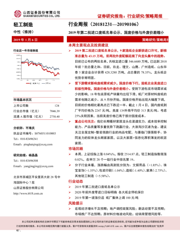 【山西证券】【20190106】20190106-山西证券-轻工制造行业周报:2019年第二批进口废纸名单公示,国废价格与外废价差缩小-13页
