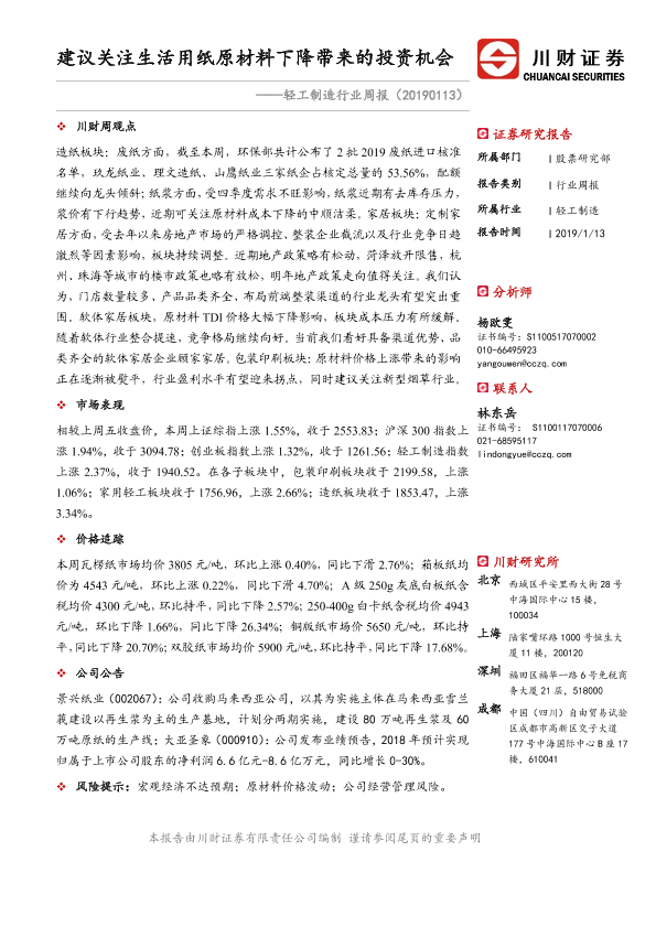 【川财证券】【20190113】轻工制造行业周报:建议关注生活用纸原材料下降带来的投资机会-11页
