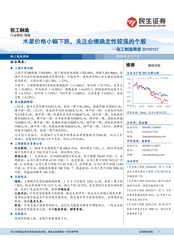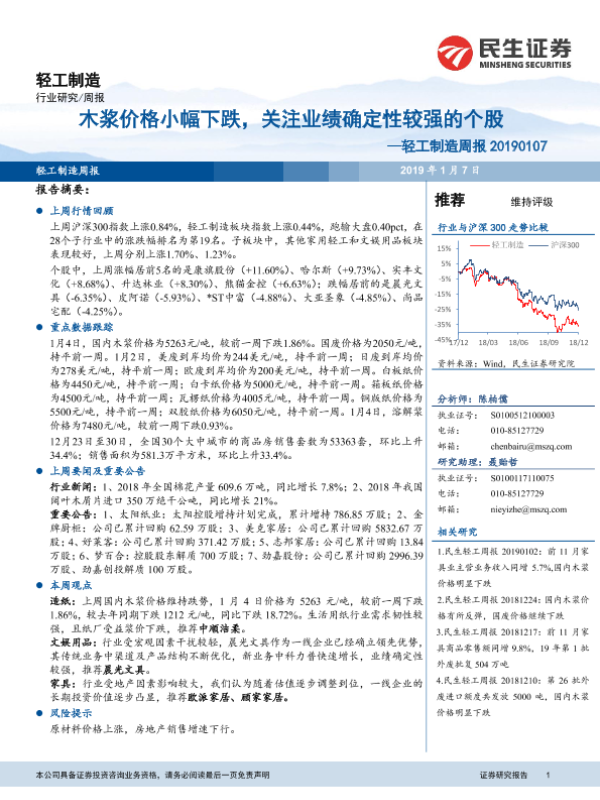 【民生证券】【20190107】20190107-民生证券-轻工制造周报:木浆价格小幅下跌,关注业绩确定性较强的个股-16页