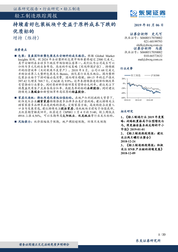 【东吴证券】【20190106】轻工制造跟踪周报:持续看好包装板块中受益于原料成本下跌的优质标的-33页
