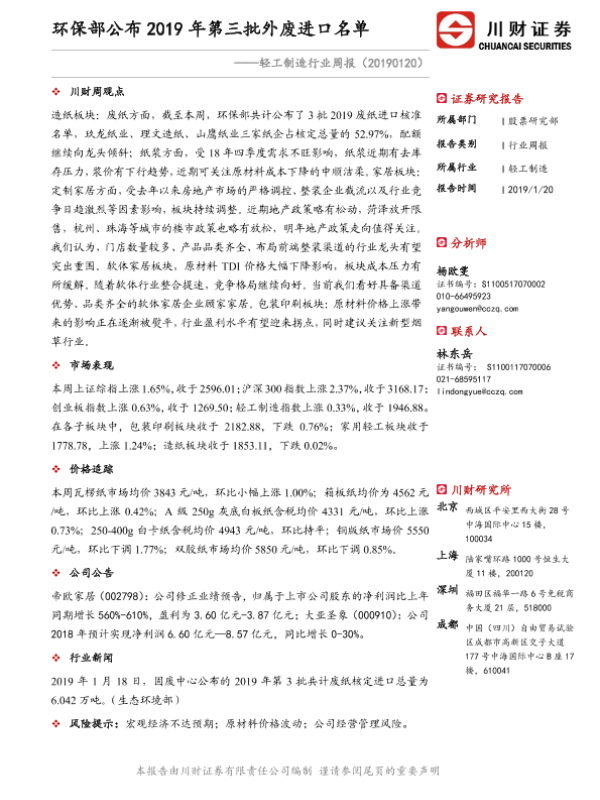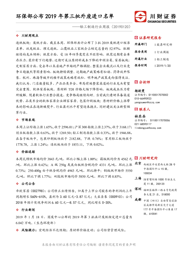 【川财证券】【20190120】轻工制造行业周报:环保部公布2019年第三批外废进口名单-11页