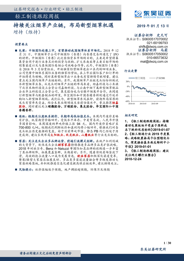 【东吴证券】【20190113】轻工制造跟踪周:持续关注烟草产业链,布局新型烟草机遇-30页