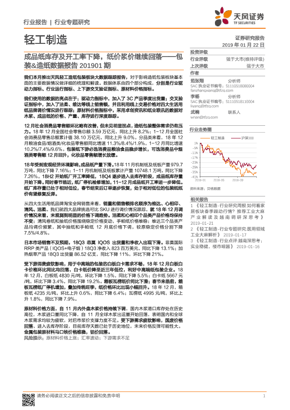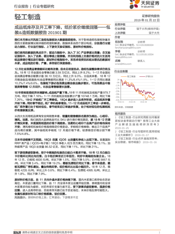【天风证券】【20190122】包装&造纸行业数据报告:成品纸库存及开工率下降,纸价浆价继续回落-29页