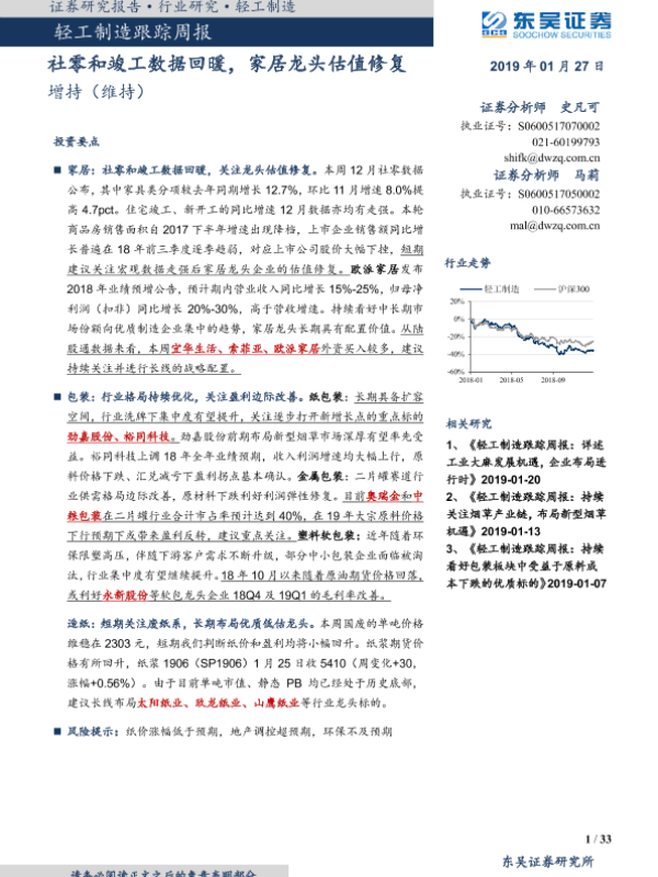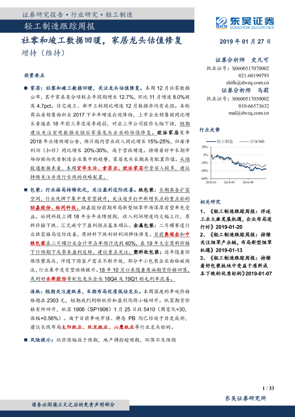 【东吴证券】【20190127】轻工制造跟踪周报:社零和竣工数据回暖,家居龙头估值修复-33页