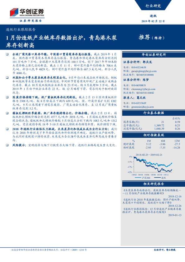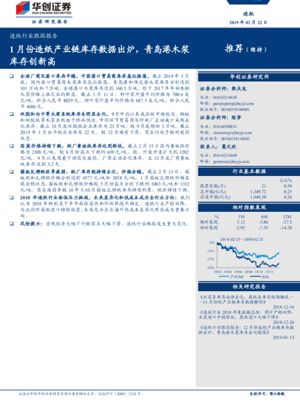 【华创证券】【20190222】20190222-华创证券-造纸行业跟踪报告:1月份造纸产业链库存数据出炉,青岛港木浆库存创新高-10页