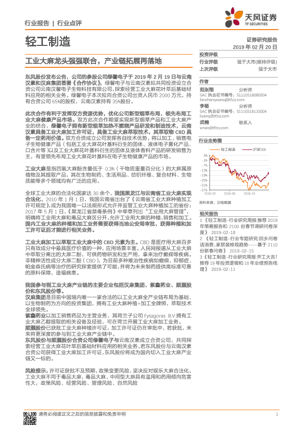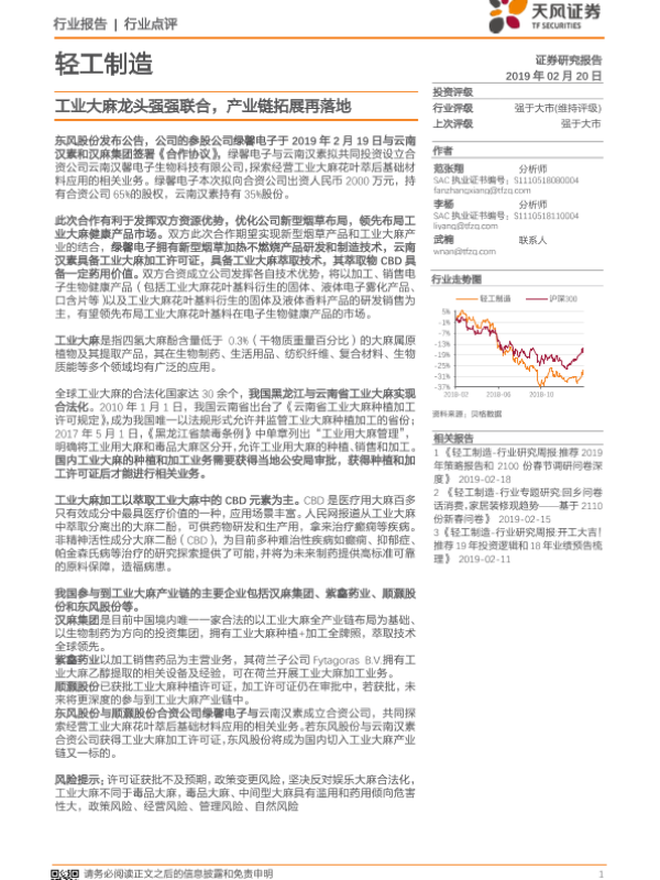 【天风证券】【20190220】轻工制造:工业大麻龙头强强联合,产业链拓展再落地-9页