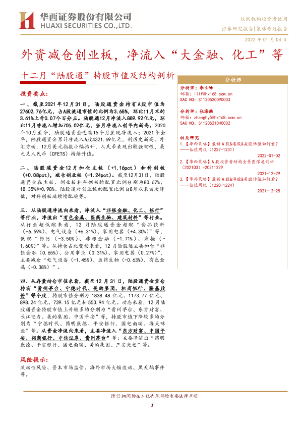 【华西证券】【20220104】十二月“陆股通”持股市值及结构剖析:外资减仓创业板,净流入“大金融、化工”等-15页