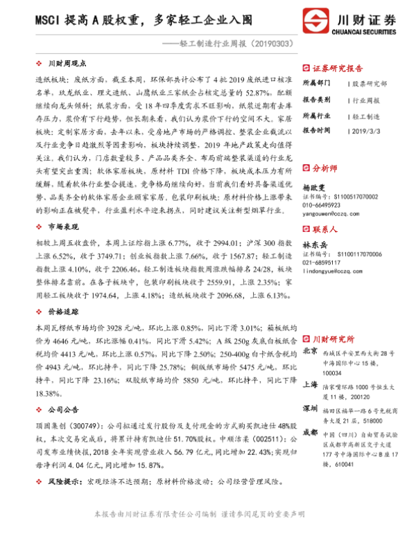 【川财证券】【20190303】轻工制造行业周报:MSCI提高A股权重,多家轻工企业入围-11页