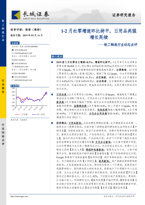 【长城证券】【20190314】20190314-长城证券-轻工制造行业动态点评:1-2月社零增速环比持平,日用品类强增长延续-10页