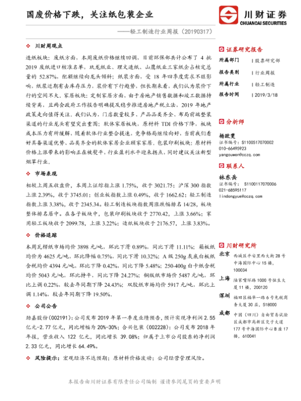【川财证券】【20190318】轻工制造行业周报:国废价格下跌,关注纸包装企业-11页