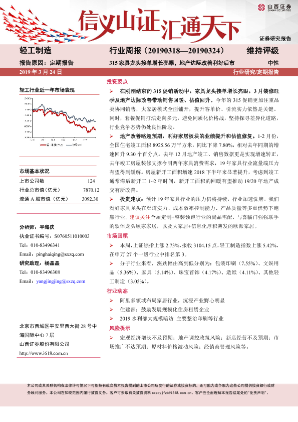 【山西证券】【20190324】20190324-山西证券-轻工制造行业周报:315家具龙头接单增长亮眼,地产边际改善利好后市-12页