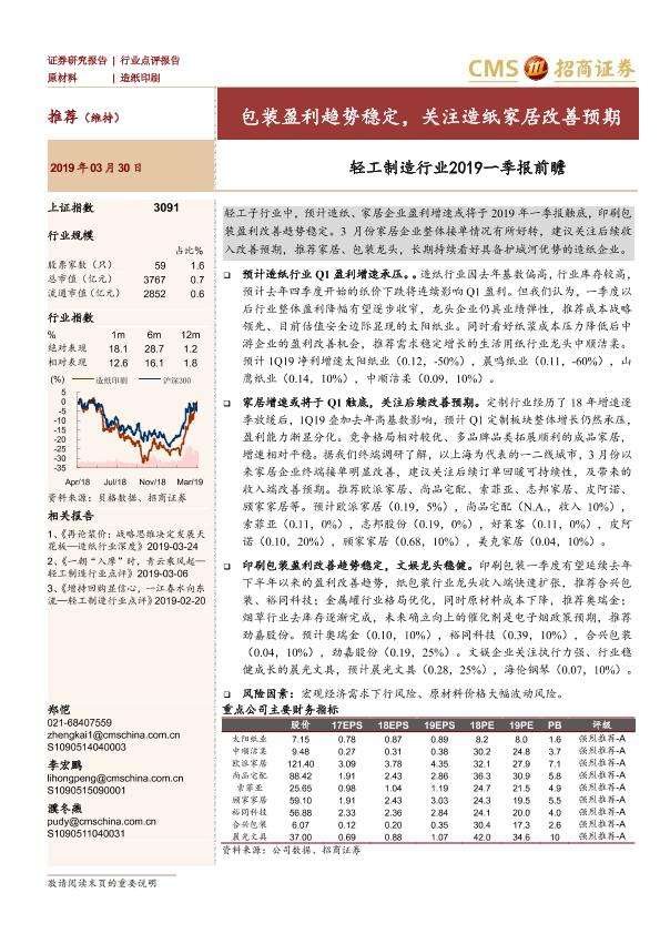 【海通证券】【20190330】轻工制造行业2019一季报前瞻:包装盈利趋势稳定,关注造纸家居改善预期-4页
