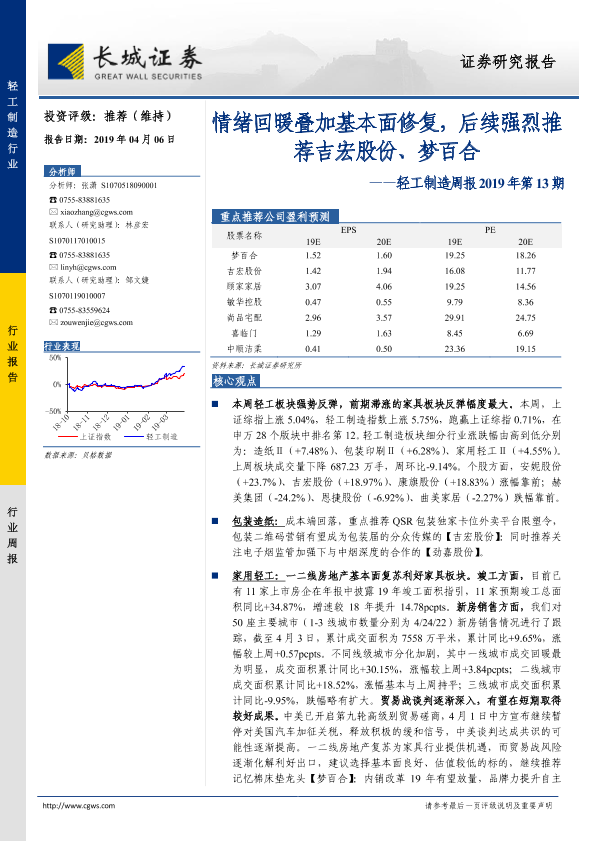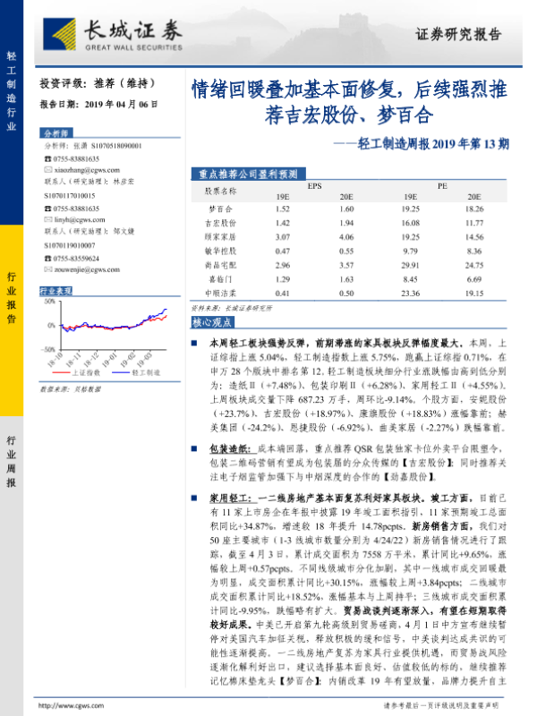 【长城证券】【20190406】轻工制造周报2019年第13期:情绪回暖叠加基本面修复,后续强烈推荐吉宏股份、梦百合-24页
