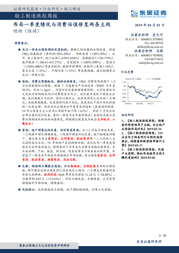 【东吴证券】【20190401】20190401-东吴证券-轻工制造跟踪周报:布局一季度绩优与消费估值修复两条主线-31页